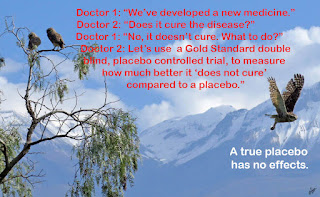 How can this happen? It happens because the goal of double blind placebo controlled study is to find a medicine that “does not cure” better than the placebo treatment “does not cure“.